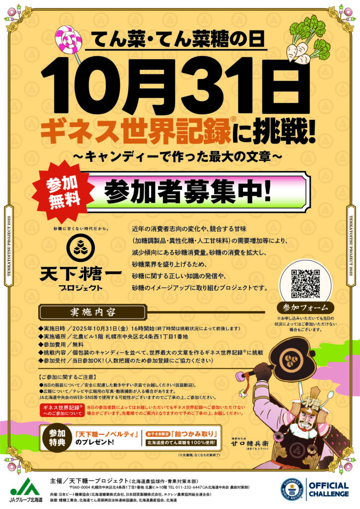 JAグループ北海道は、てん菜(甜菜)とてん菜糖の魅力を広く発信する「天下糖一プロジェクト」の一環として、10月31日の「てん菜・てん菜糖の日」にギネス世界記録™への挑戦イベントを開催します。個包装のキャンディー(飴)を並べて、文章を作る記録に挑戦し、お子さんや大人の皆さまとともに達成を目指します。仮装でのご参加も歓迎します。